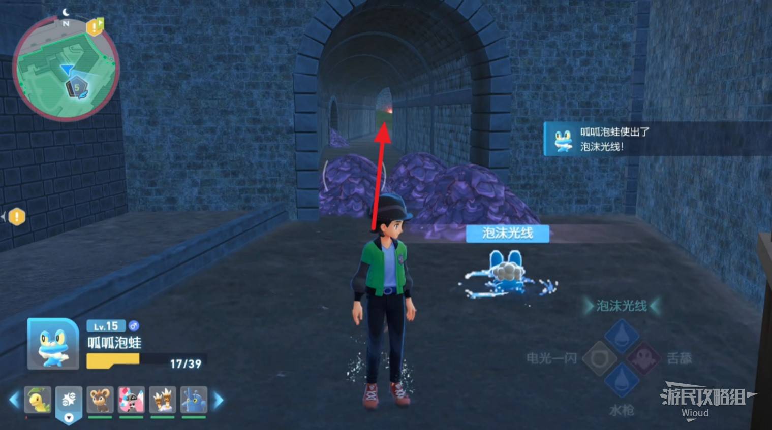 从地图左侧的入口进入5号野生特区,向左走,你会发现一片被污泥覆盖的区域。这里需要用水系技能来破坏障碍物,才能继续前进。